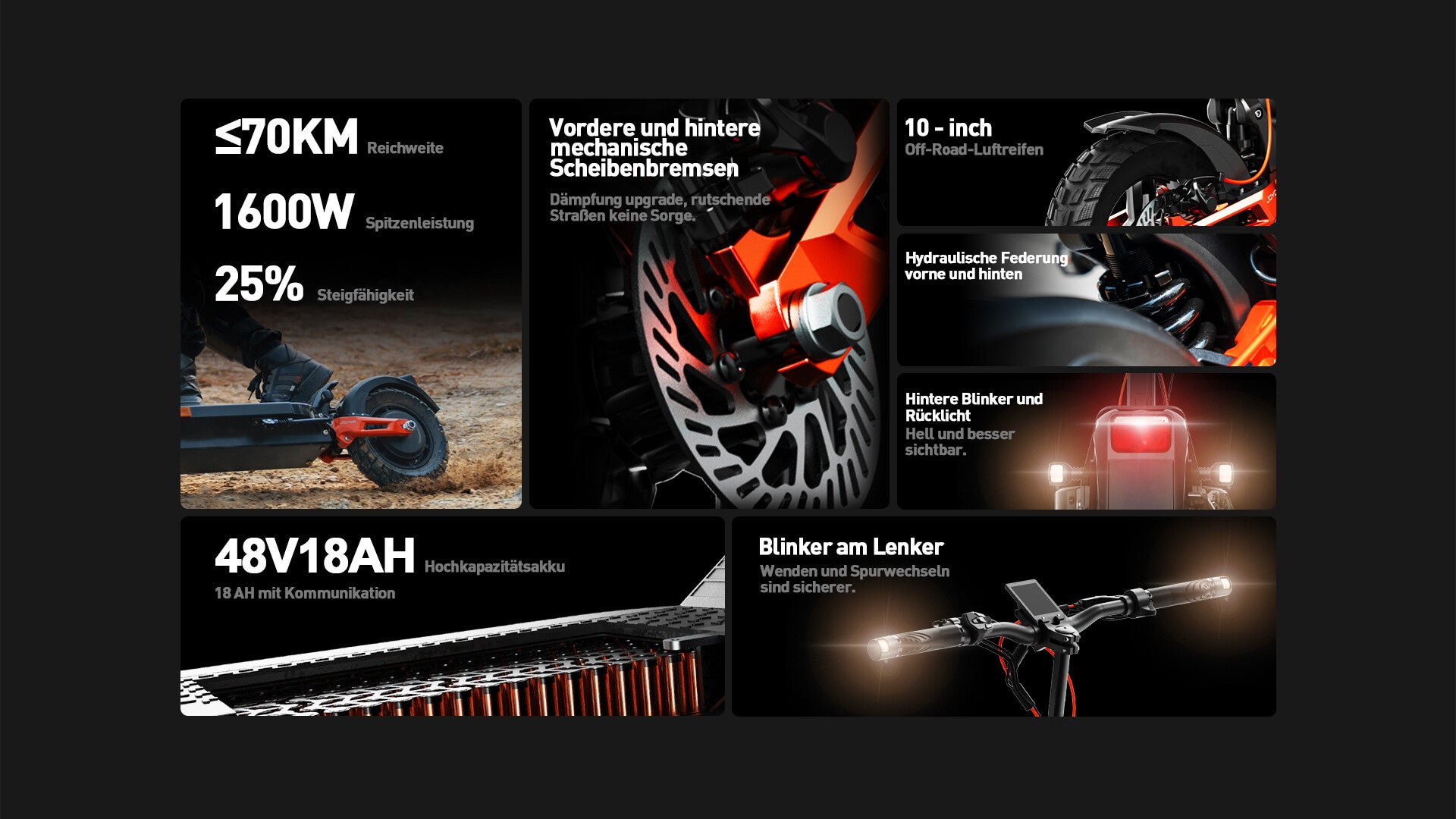 - Hohe Reichweite: bis zu 70 km mit 48V / 18Ah Akku (864 Wh)