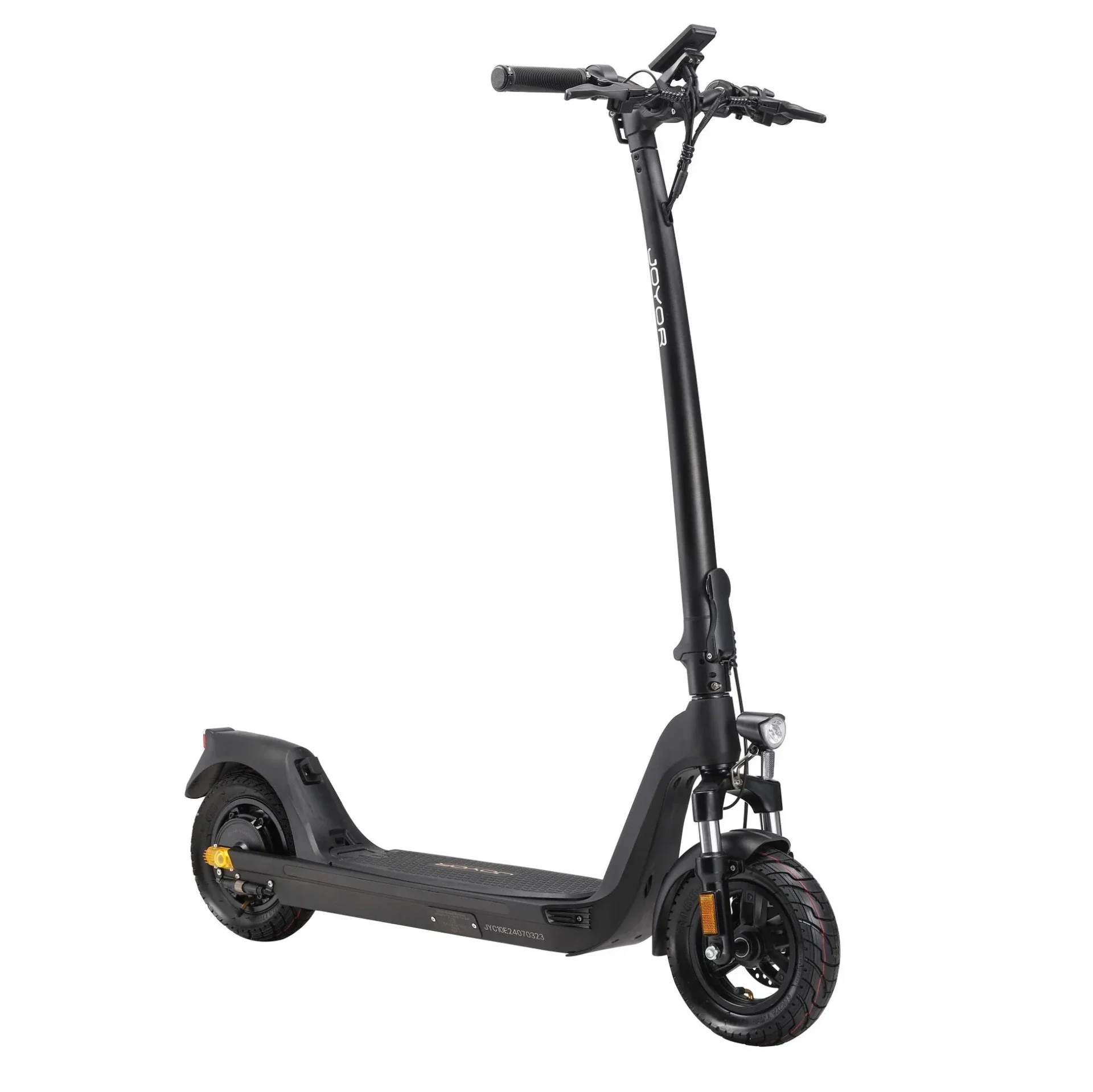 Der Joyor C10E Elektro-Scooter vereint hohen Fahrkomfort mit fortschrittlicher Sicherheitstechnologie. Der robuste Rahmen aus einer Magnesiumlegierung sorgt für eine stabile und langlebige Konstruktion, während die 10-Zoll-Luftreifen eine angenehme Fahrt auf verschiedenen Untergründen gewährleisten. Die vorderen und hinteren Scheibenbremsen bieten hervorragende Bremsleistung und Sicherheit bei jeder Fahrt. Zusätzlich ist der Scooter mit einer hydraulischen Vorderradfederung ausgestattet, die Stöße effektiv abfedert und für eine sanfte Fahrt sorgt.